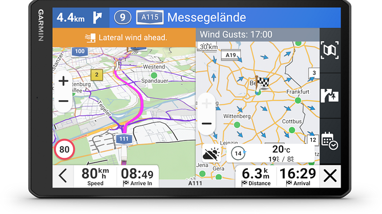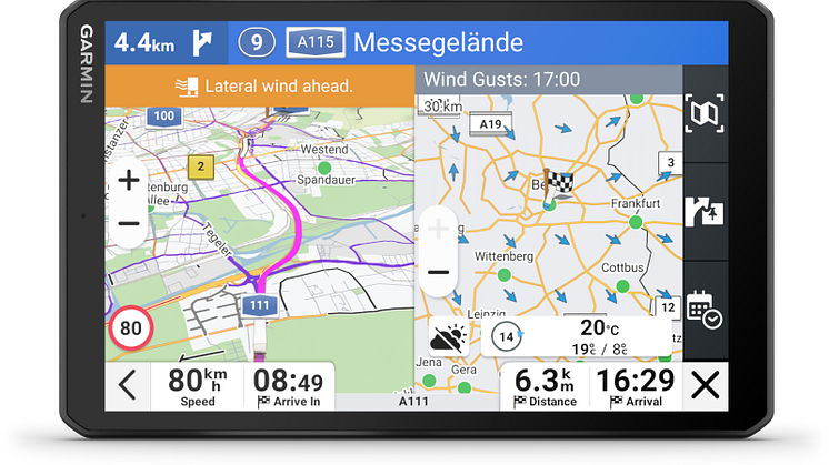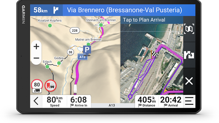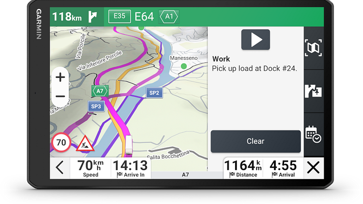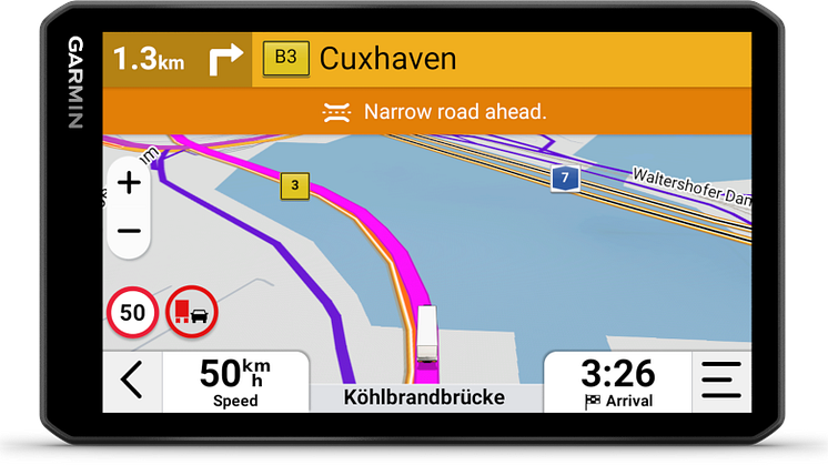 - Tilpasset lastebilruting: Finn de riktige rutene basert på kjøretøyets størrelse og vekt2, med varsler for kommende brohøyder, skarpe svinger og mer.