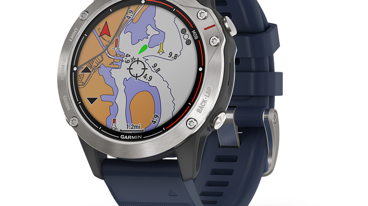Med quatix 6 er det enkelt å markere og lagre veipunkter, uansett hvor du befinner deg på båten, uten å stå ved kartplotteren. Klokken kan også benyttes for å styre underholdningssystemet ombord via appen Fusion-Link Lite. quatix 6 støtter også BlueChart® g3-sjøkart med integrerte Navionics®-data, som kan benyttes for navigering, eller som et navigasjonsverktøy å ha i reserve, om man ikke er tilkoblet kartplotter.