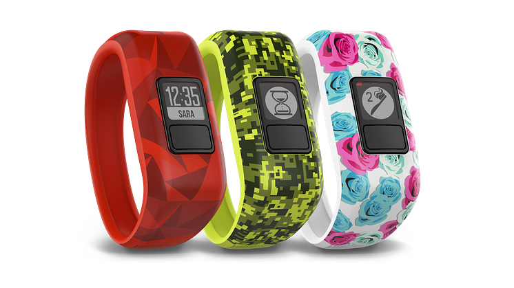Garmin vívofit jr., en aktivitetsmåler for barn. Aktivitetsmåleren er stilig, med et barnevennlig design, er komfortabel, slitesterk og vanntett. Enheten leveres med batterilevetid på opptil ett år og viser aktivitetsdata som skritt, søvn og en oversikt for anbefalte 60 minutter med aktivitet for barn per dag. Det medfølger en gratis mobilapplikasjon som skal brukes på foresattes mobiltelefon.
