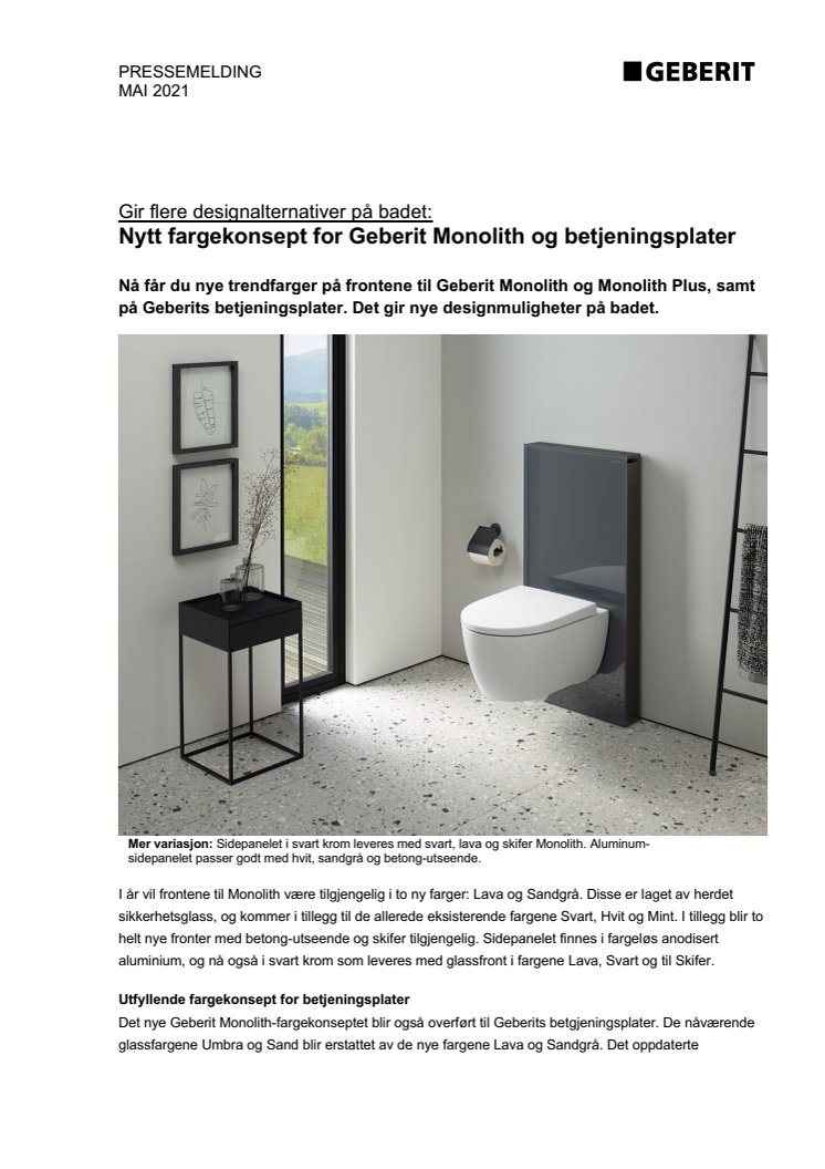 Nytt fargekonsept for Geberit Monolith og betjeningsplater