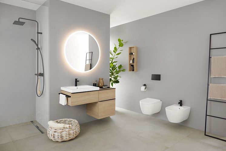 2023_iCon Bathroom with lay-on washbasin white matt, WC wall-hung white matt, Bidet wall-hung white matt, Option Mirror Round 90 light on_2_Big Size