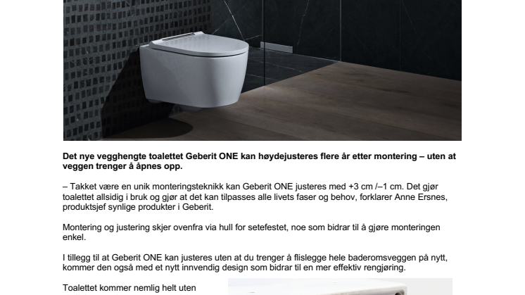 – Takket være en unik monteringsteknikk kan Geberit ONE justeres med +3 cm /–1 cm. Det gjør toalettet allsidig i bruk og gjør at det kan tilpasses alle livets faser og behov, forklarer Anne Ersnes, produktsjef synlige produkter i Geberit.