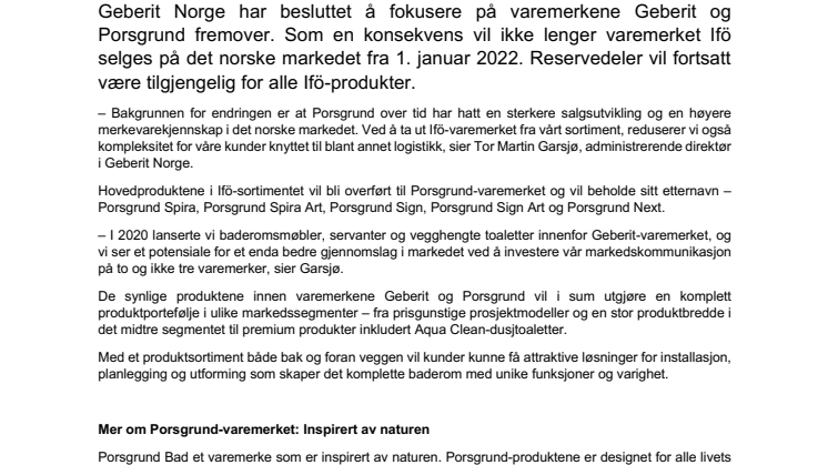 – Bakgrunnen for endringen er at Porsgrund over tid har hatt en sterkere salgsutvikling og en høyere merkevarekjennskap i det norske markedet. Ved å ta ut Ifö-varemerket fra vårt sortiment, reduserer vi også kompleksitet for våre kunder knyttet til blant annet logistikk, sier Tor Martin Garsjø, administrerende direktør i Geberit Norge.