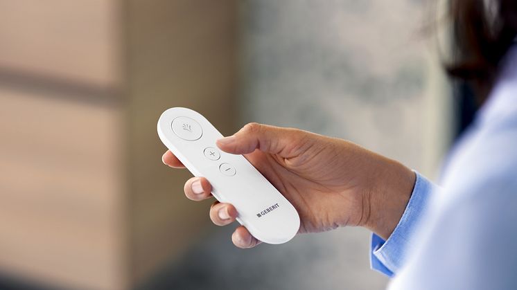 Toalettet styres enkelt med en hånd ved hjelp av den medfølgende fjernkontrollen. Geberit Home-appen på telefonen tilbyr også personlige tilpasninger.