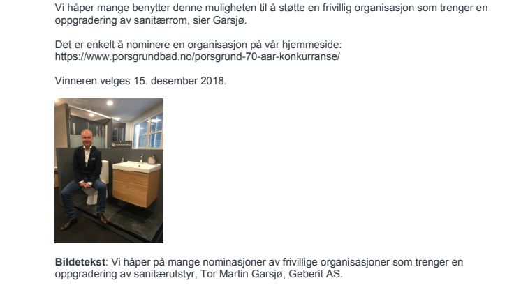 Porsgrund Bad feirer 70 år og i den forbindelse ønsker vi å gi en gave til de som fortjener det mest. Over hele landet jobber frivillige organisasjoner og idrettslag med begrensede midler for at andre skal ha det bra. Det betyr at fasiliteter som sanitærrom ikke blir prioritert. Derfor ønsker vi å gi dem en gave, sier Tor Martin Garsjø administrerende direktør hos Geberit AS.