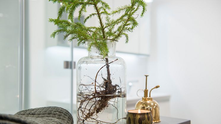 – Gå ut i skogen og finn kvister eller små grantrespirer som kan settes i en krukke. Ta med en trestokk og legg over badekaret for å sette baderomsprodukter på. Eller pynt en stabel med håndklær med dekorative kongler, foreslår Therese.