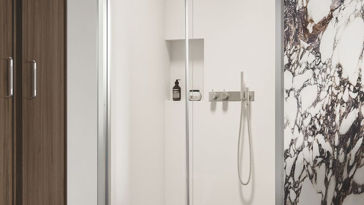 Å plassere dusjen i et av hjørnene på badet er et klassisk valg – våtrommet skjermes fra to sider, samtidig som to av sidene er åpne. Den ideelle løsningen for mindre bad er buede dører. De buede dørene med sikkerhetsglass kan åpnes utover for å få tilgang til dusjen, samtidig som de kan legges innover mot en bakvegg for å maksimere plassen. Det funksjonelle, klare glassdesignet og de smale aluminiumprofilene gir også en visuelt lettere og mer innbydende opplevelse.