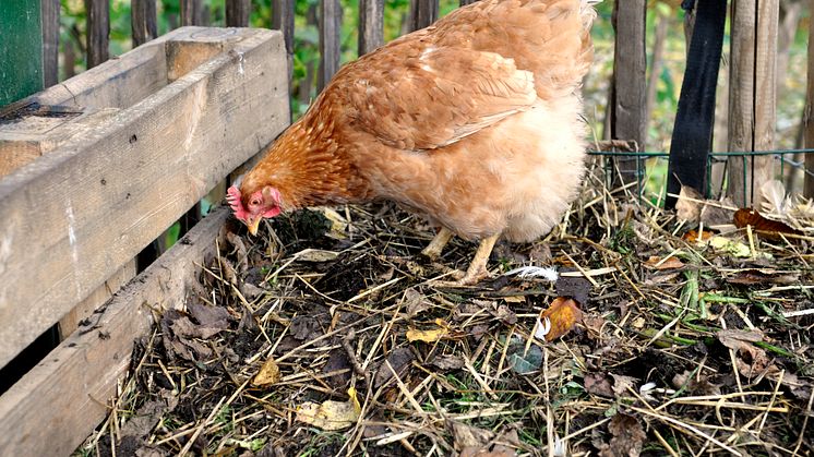 Hønene spiser av komposten, krafser og hakker i jorda og forsyner seg med det de har lyst på, enten det er brødskorper, salatrester eller biter av rå laks. I hønsehuset har de også tilgang på fôr og friskt, rent vann til enhver tid. Som gjenytelse avgir de verdifullt bidrag til komposten i form av bæsj – den aller raskeste måten å kompostere på er nemlig å sende avfallet gjennom fordøyelseskanalen til et dyr.