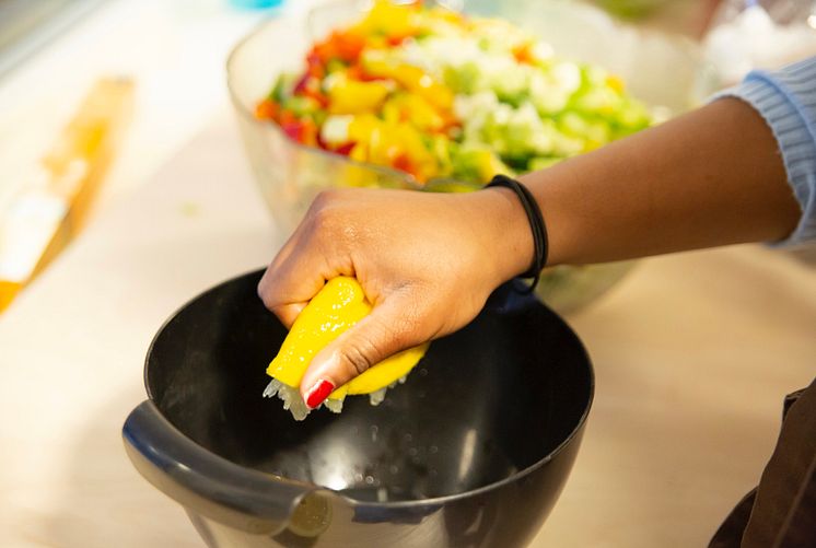 – Hvor er rapsoljen? Kan jeg bruke sitron i stedet for lime? Hvor er stavmikseren? Nå mangler vi to kokker! Stemningen er nokså hektisk. Det oppstår litt panikk når bakepapiret sitter som limt på knekkebrødet. Men det går seg til og nøyaktig klokken 18.00 er benkene vasket, maten ferdig og fatene dandert. Utenfor står gjestene klare – og sultne.