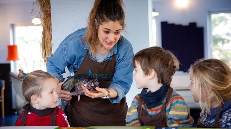 Tessa Anderson er på plass og går gjennom hele fiskens anatomi. Hvor hører den hjemme, hva spiser den og hvordan puster egentlig fisken? Barna får kjenne på svømmeblæra, på gjellene og på tunga. Noen synes det er litt skummelt, men de aller fleste putter fingeren ivrig og med skrekkblandet fryd inn i gapet på seien.