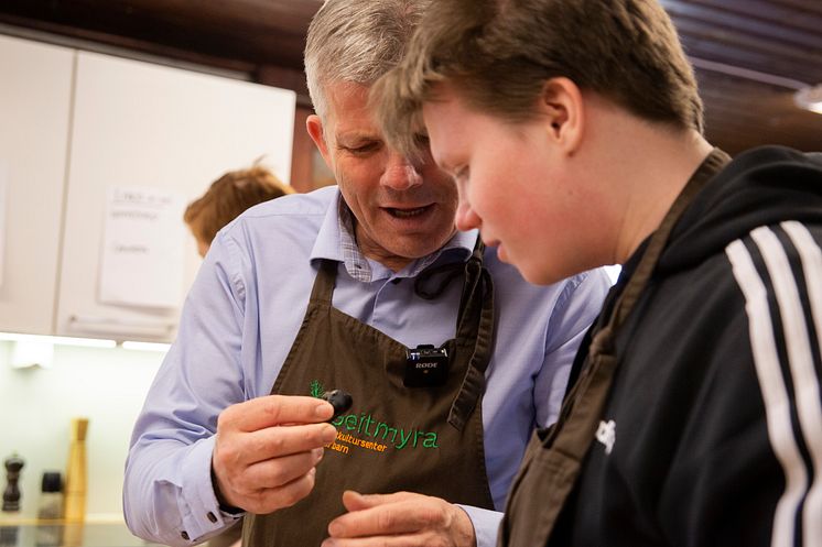Etter en kort omvisning på Geitmyra gård, blir Skjæran satt til å filetere kveite. Og det gjør han med innlevelse. Han er tross alt fra Helgelandskysten. Under matlagingen snakker ministeren med elevene om konservering og sjømatnæringen. – Vi må finne gode løsninger for havbruk, sier han. – Havet er framtiden. Det er en kilde der vi henter mat, penger og energi fra. Og sjømat er godt for folkehelsa og for jordens helse.
