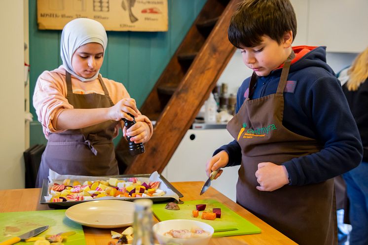 Geitmyra er en ikke-kommersiell stiftelse som jobber for å gi barn og ungdom tilgang til og kunnskap om god og bærekraftig mat. På Geitmyra er det barna som er hovedpersonene. De lager maten selv og opplever at de får det til. Barna lærer hvor maten kommer fra ved å smake, lukte, kutte og koke. Mestringen og matgleden er viktig. Den praktiske undervisningen knyttes sammen med andre teoretiske fag som språk, hirstorie, geografi, matematikk og kjemi. – Vi håper å kunne tilby alle sjetteklassingene i Tønsberg kommune ukesundervisning på Geitmyra, forteller Kine. Da er elevene på Geitmyra i en hel uke og undervisningen bygges rundt kompetansemålene i mat og helse. Temaene varierer etter sesong. – Hele tiden sniker vi inn kunnskap om samfunnsfag, språk, naturfag og matematikk i undervisningen. Når elevene måler og veier råvarene og når de henter egg i hønsegården, lærer om de store sammenhengene gjennom egne erfaringer.