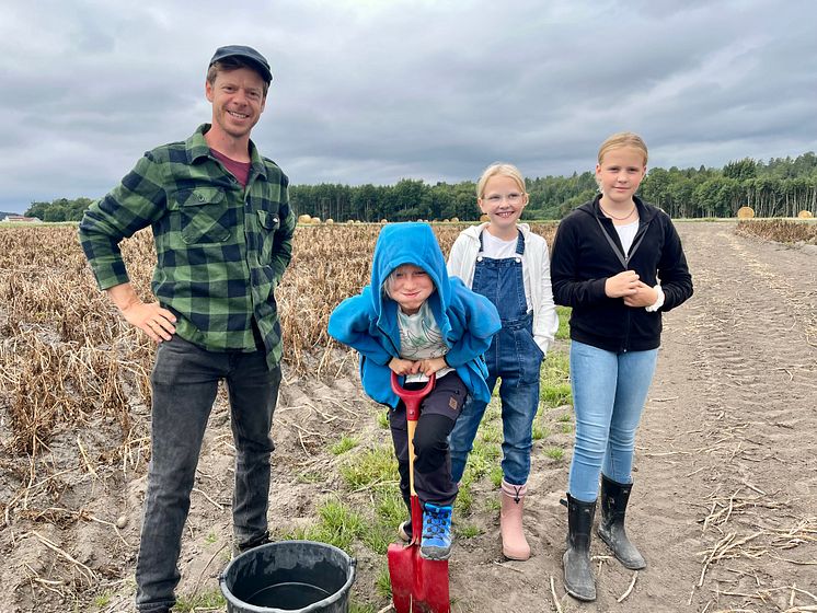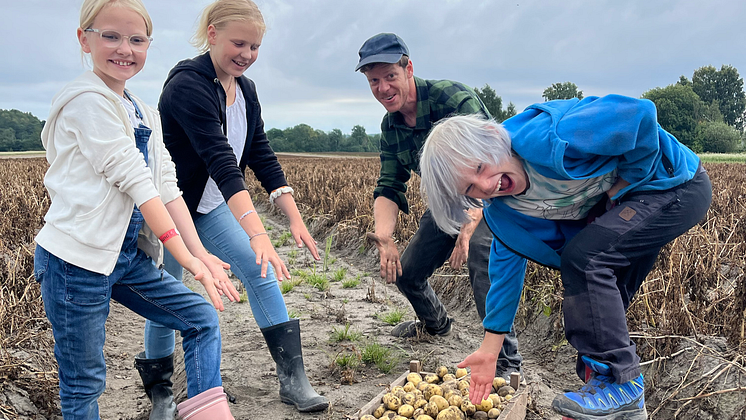 – Dette er nesten som å være på skattejakt! Nora, Emilie og Felix er med Lars Bjertnæs i åkeren til Bjernæs & Hoel for å ta opp poteter. Potetene skal serveres under middagen som regjeringen inviterer til på rådhuset i Oslo i anledning Kavli-prisen 6. september.