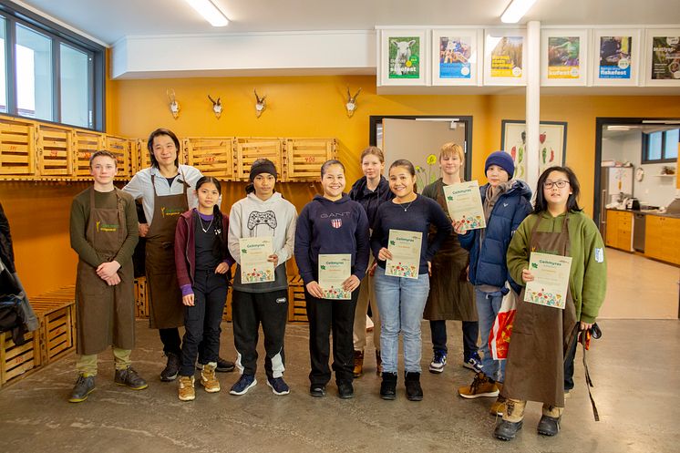 Under måltidet snakker Simen om juniorkokk i jobb og oppfordrer ungdommene til å legge inn en søknad. Mange er interesserte. – Jeg lærer alltid noe nytt her på Geitmyra, sier Benjamin. Selv om alle er stappmette etter den store lunsjbuffeten, er del likevel plass til et stykke med eplesmuldrepai med krem. Men det er bare så vidt.