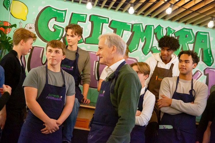 Underveis snakker statsministeren med de unge kokkene om jobben som juniorkokk. Om mestring, det å tjene egne penger og om samarbeid og vennskap mellom ungdom fra hele byen. – Dette er en jobb med mening og samtidig får dere med dere noe dere har glede av ellers også – som å lage middag til familie og venner, sier Jonas.