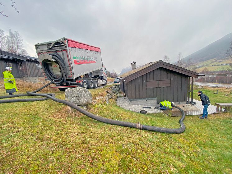 Krypkjelleren til hytta til Bentzen med blåsing av skumglass inn gjennom ventilasjonsluker