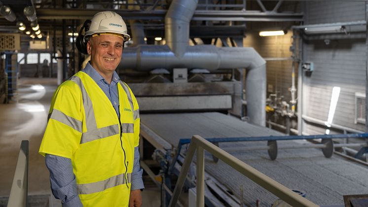 Truls Børresen foran skumglassovn i Glasopor-fabrikken i Onsøy