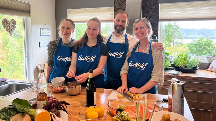 Familien Kaland forbereder seg til Godfisk sin familiekonkurranse "Sjømatfamilien" F.v. Karoline Kaland, Sofie Brustad Kaland, mentor Adam Bjerck og Gunn Beate Brustad Kaland.