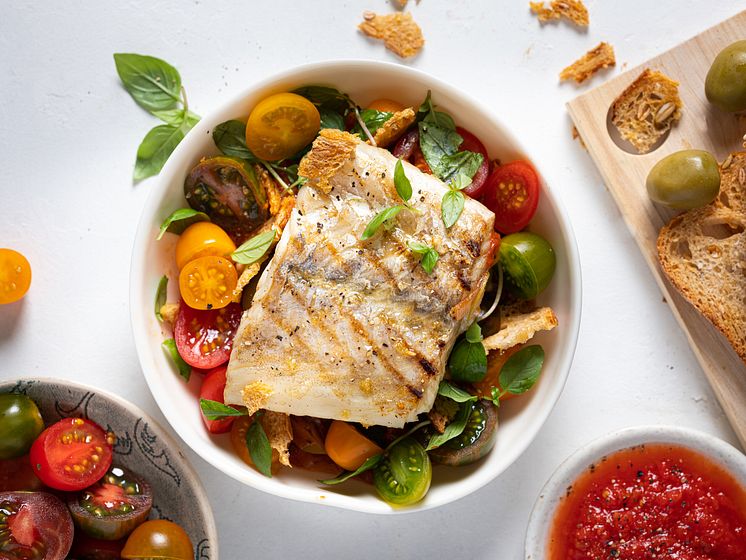 Grillet tørrfisk, oliven, tomater og sprøtt surdeigsbrød