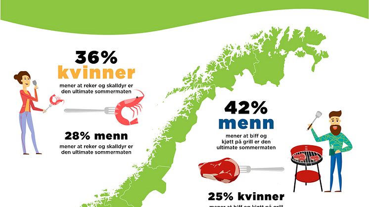 Kan surf’n’turf - biff og skalldyr i samme rett, bli årets sommerslager? Ny undersøkelse viser nemlig at menn og kvinner ikke vil spise det samme på sommeren.