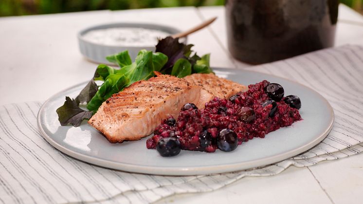 - Bærenes klare farger står godt til det hvite og røde fiskekjøttet. En blanding av blåbær, bringebær og rips passer perfekt til helbakt laksefilet.
