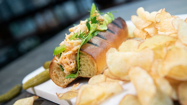 Her er krabbens svar på lobster roll. Retten passer godt som middag eller kveldskos. Bland krabbekjøttet med majones, sitronsaft, chilisaus, vårløk og stangselleri. Fyll det i salatblad i pølsebrød og topp med friske urte. Oppskrift.
