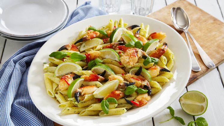 Gi krabbeklørne ekstra god smak med hvitløk og chili. Her servers klørne sammen med pasta vendt i hjemmelaget basilikumsaus. Oppskrift.