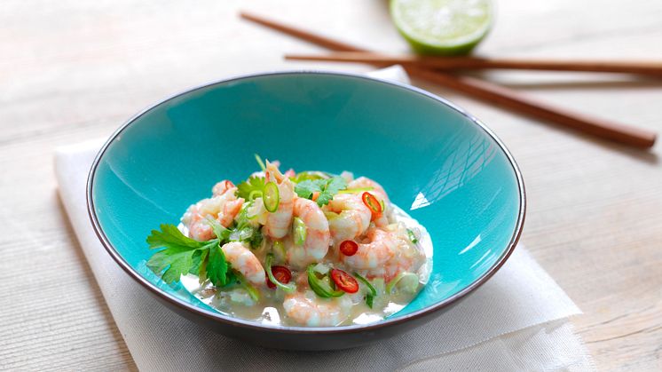 En frisk kombinasjon av reker, sitrus og urter som fungerer både som tapas og forrett. Oppskrift.
