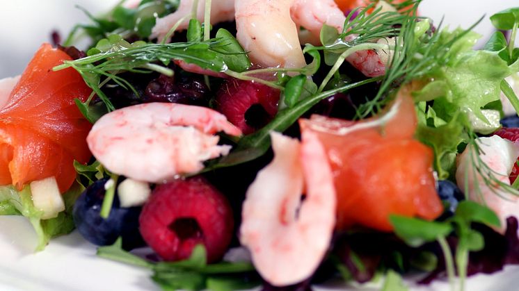 Sommersalat med reker, røkt laks, bringebær og blåbær