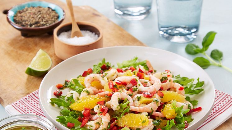 Salat med reker, appelsin og basilikum