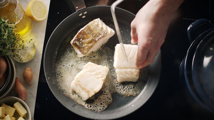 Snu fileten, skru ned varmen og la den steke noen få minutter på den andre siden. Ønsker du å smørsteke skreien tilsettes smør når fileten snus og varmen skrus ned.