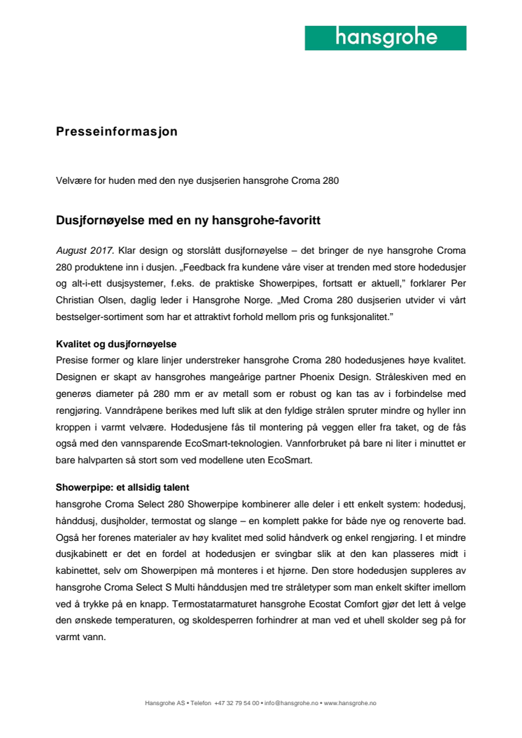 Velvære for huden med den nye dusjserien hansgrohe Croma 280.