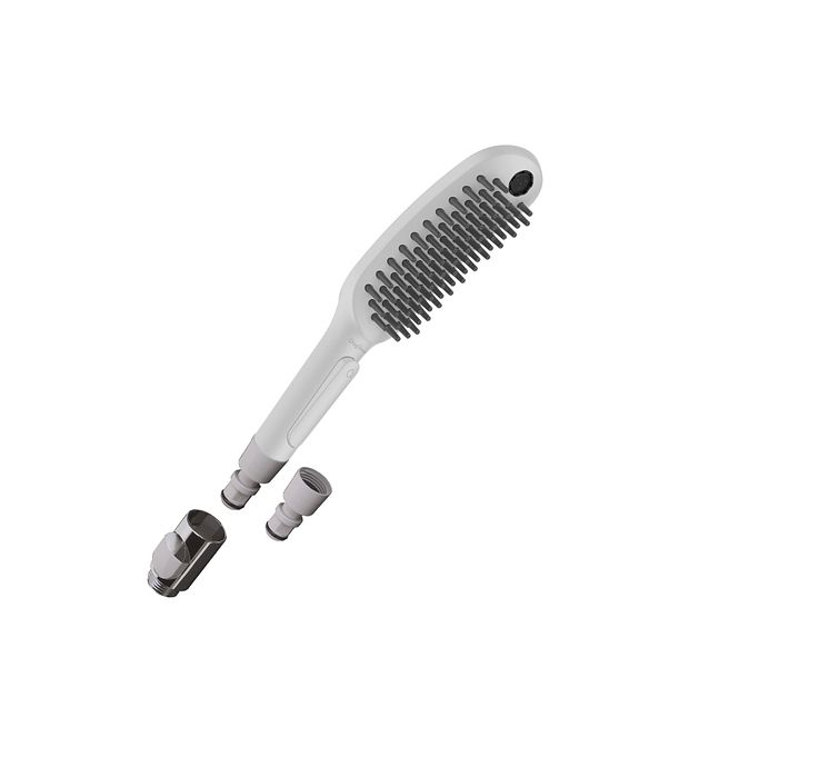 DogShower fra hansgrohe er tilgjengelig i forskjellige overflater: rosa, sort, hvit og blå.