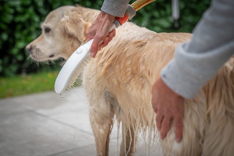 Sunn og velstelt pels uten stress: hansgrohe DogShower sørger for rolig og grundig rengjøring av hunden din med tre stråletyper og komfortable silikondyser.