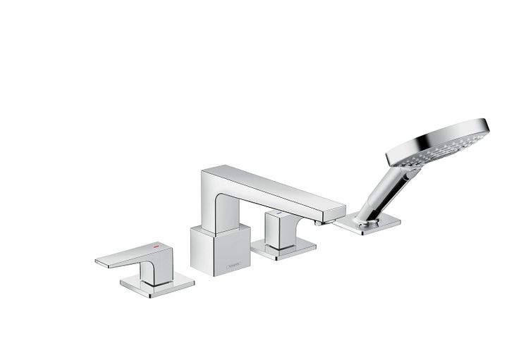 hansgrohe Metropol kararmatur til montering på karkant. Hånddusjen har tre stråletyper.