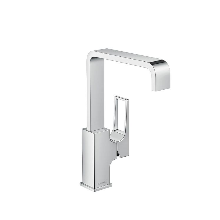 hansgrohe Metropol armaturet med høy svingtut gør det lett å fylle på høye beholdere, vaskebøtter etc. Her med bøylegrep.