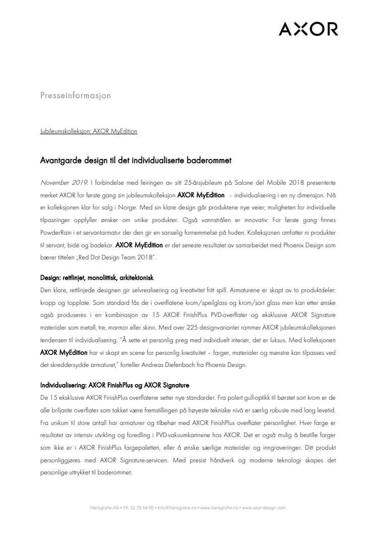 I forbindelse med feiringen av sitt 25-årsjubileum på Salone del Mobile 2018 presenterte merket AXOR for første gang sin jubileumskolleksjon AXOR MyEdition – individualisering i en ny dimensjon. Nå er kolleksjonen klar for salg i Norge. Med sin klare design går produktene nye veier; muligheten for individuelle tilpasninger oppfyller ønsker om unike produkter. Også vannstrålen er innovativ: For første gang finnes PowderRain i et servantarmatur der den gir en sanselig fornemmelse på huden. Kolleksjonen omfatter ni produkter til servant, bidé og badekar. AXOR MyEdition er det seneste resultatet av samarbeidet med Phoenix Design som bærer tittelen „Red Dot Design Team 2018“.