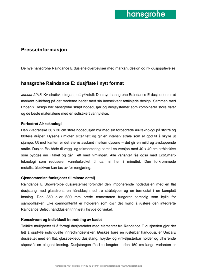 Kvadratisk, elegant, uttrykksfull: Den nye hansgrohe Raindance E dusjserien er et markant blikkfang på det moderne badet med sin konsekvent rettlinjede design. Sammen med Phoenix Design har hansgrohe skapt hodedusjer og dusjsystemer som kombinerer store flater og de beste materialene med en sofistikert vannytelse.