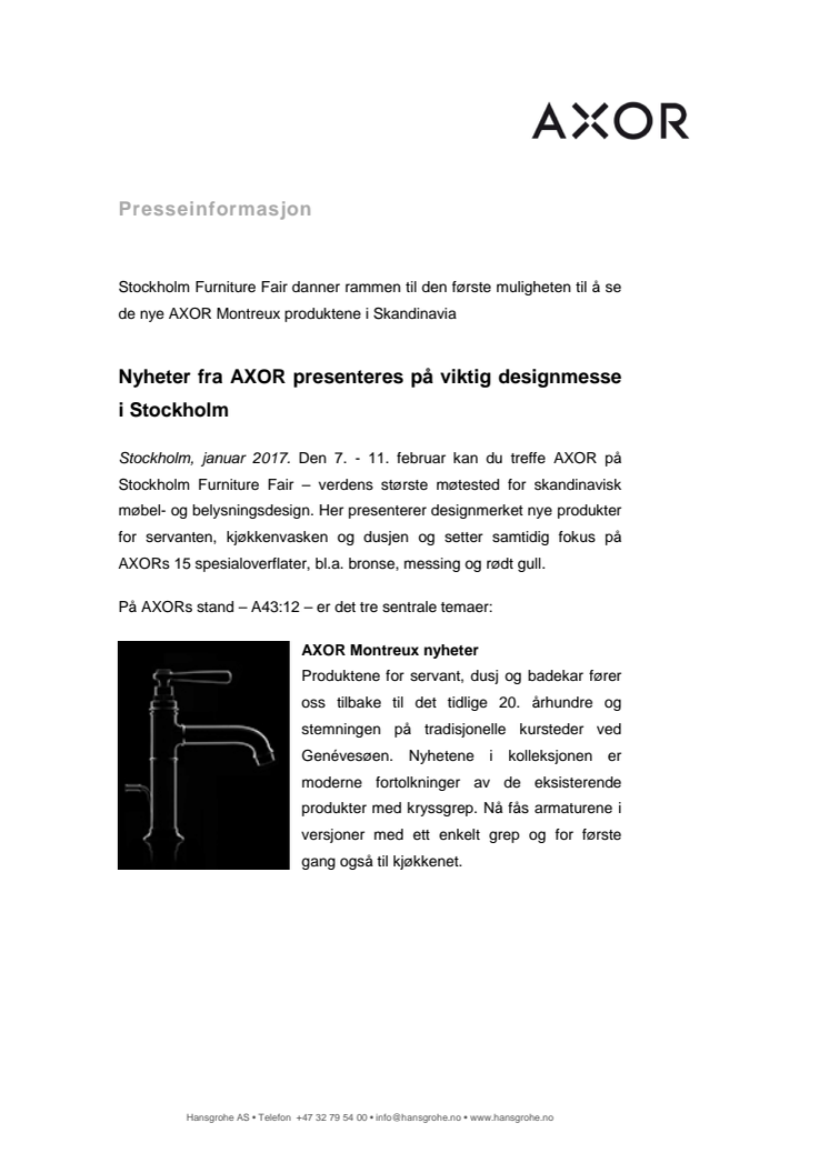 Den 7. - 11. februar kan du treffe AXOR på Stockholm Furniture Fair – verdens største møtested for skandinavisk møbel- og belysningsdesign. Her presenterer designmerket nye produkter for servanten, kjøkkenvasken og dusjen og setter samtidig fokus på AXORs 15 spesialoverflater, bl.a. bronse, messing og rødt gull.