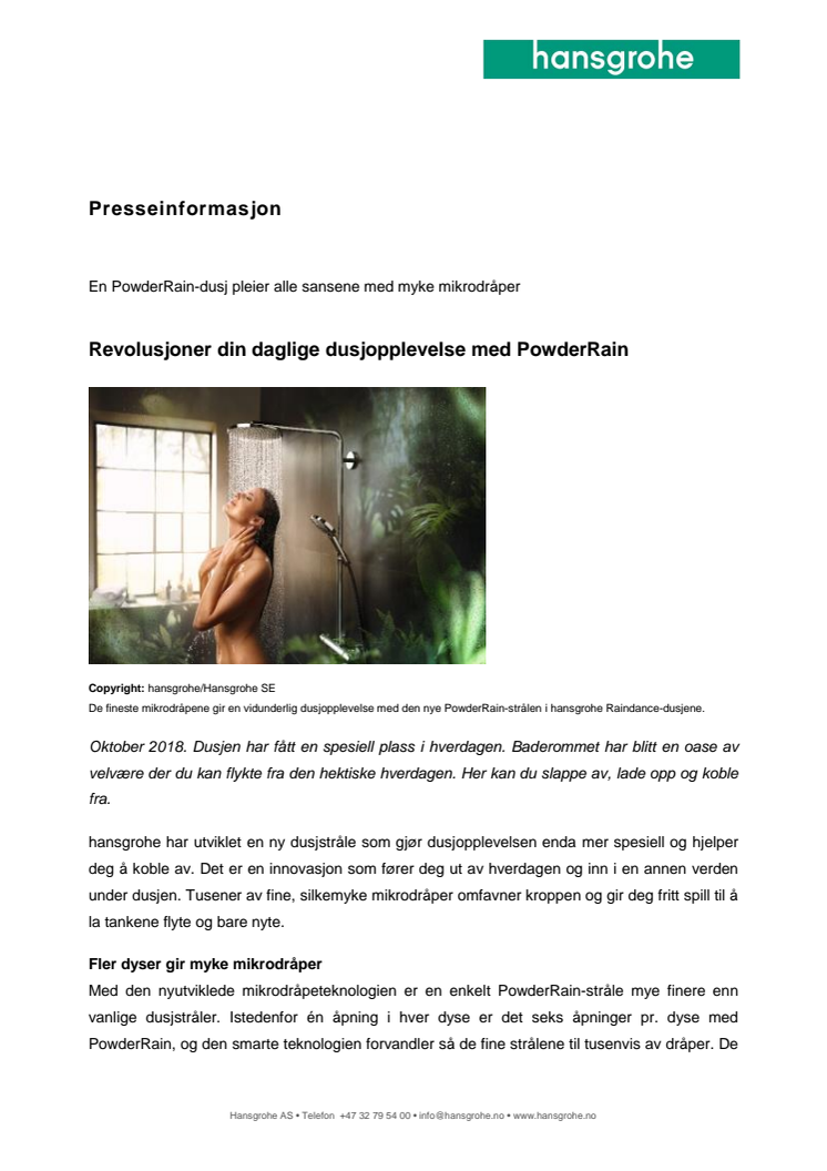 PowderRain finnes i første omgang i hånddusjen hansgrohe Raindance Select S 120 PowderRain. Denne dusjen byr på stråletypene Rain, WhirlAir og nå også PowderRain. Rain er med sitt brede dusjregn den ideelle strålen til hverdagens dusjrutine. Massasjestrålen WhirlAir frisker målrettet og kraftfullt hud og muskler opp. PowderRain sørger med myke mikrodråper for dyp avspenning og nytelse. Det er lett å skifte mellom stråletypene med ett trykk på Select-knappen på grepet – også med én hånd og lukkede øyne. PowderRain-programmet omfatter også Raindance hodedusjer, dusjsett og Showerpipe dusjsystemet med to dusjer og termostatarmatur. Dermed kan den nye dusjfornøyelsen finne plass i ethvert baderom.