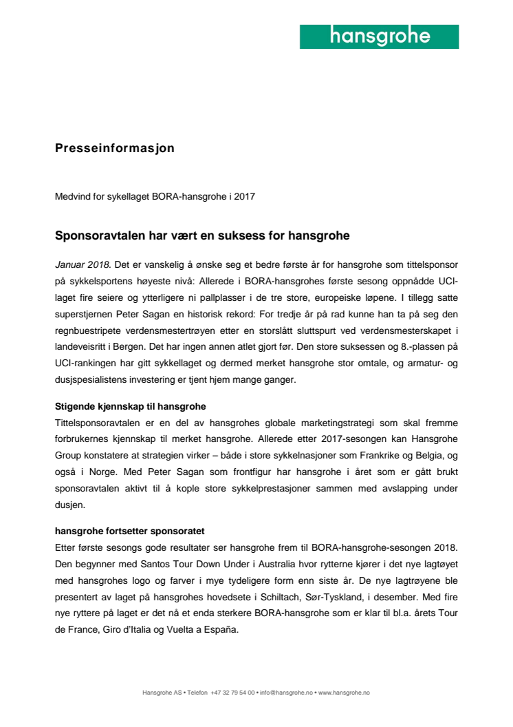 Tittelsponsoravtalen er en del av hansgrohes globale marketingstrategi som skal fremme forbrukernes kjennskap til merket hansgrohe. Allerede etter 2017-sesongen kan Hansgrohe Group konstatere at strategien virker – både i store sykkelnasjoner som Frankrike og Belgia, og også i Norge. Med Peter Sagan som frontfigur har hansgrohe i året som er gått brukt sponsoravtalen aktivt til å kople store sykkelprestasjoner sammen med avslapping under dusjen.
