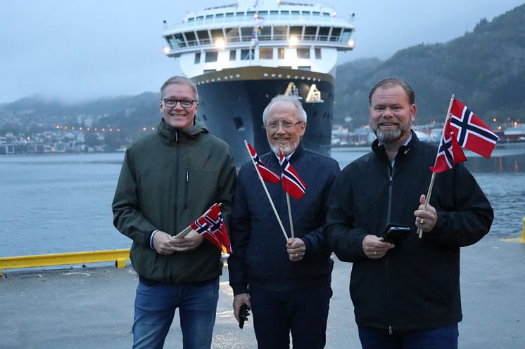 SVP Sales & Marketing, Tor Johan Pedersen, CFO Arne Johan Dale and CEO Bent Martini greets Havila Castor in Bergen May 5th 2022.