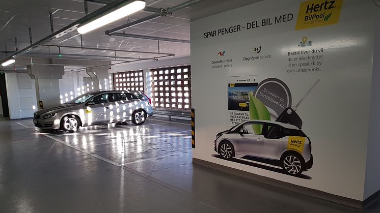 Bilene står sentralt plassert i Skovly P-hus til høyre ut fra trappen. Det er skiltet med Hertz Bilpool på plassene.