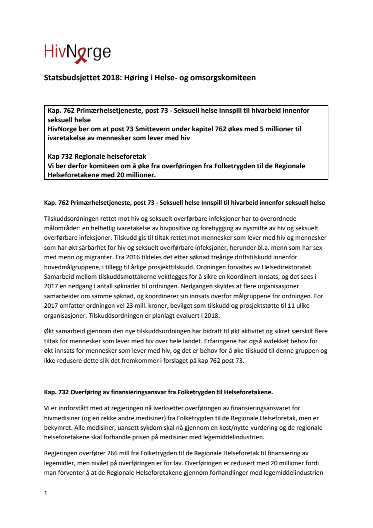 HivNorge møter i Stortinget i ettermiddag for å komme med innspill til statsbudsjettet for neste år. Generalsekretær Anne-Karin Kolstad er særskilt bekymret for overføring av finansieringsordningen fra Folketrygden til helseforetakene. Vil dette kunne redusere kvaliteten på hivbehandlingen og vil det gjøre arbeidet med å tilby PEP og PrEP vanskeligere, spør generalsekretæren.