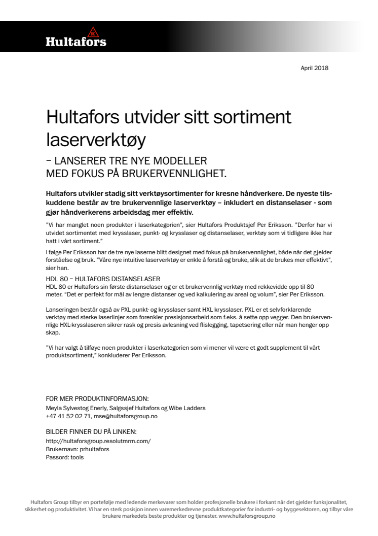 Hultafors lanserer tre nye modeller med fokus på brukervennlighet. Hultafors utvikler stadig sitt verktøysortimenter for kresne håndverkere. De nyeste tilskuddene består av tre brukervennlige laserverktøy – inkludert en distanselaser - som gjør håndverkerens arbeidsdag mer effektiv.