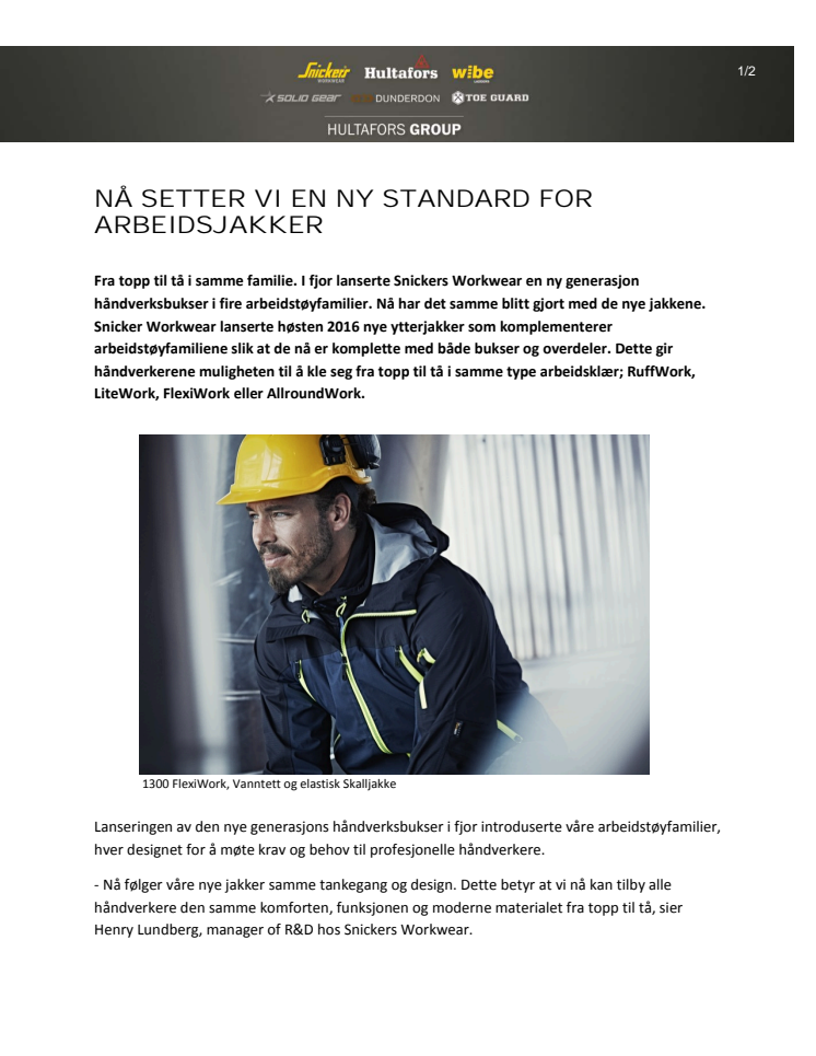I fjor lanserte Snickers Workwear en ny generasjon håndverksbukser i fire arbeidstøyfamilier. Nå har det samme blitt gjort med de nye jakkene. Snicker Workwear lanserte høsten 2016 nye ytterjakker som komplementerer arbeidstøyfamiliene slik at de nå er komplette med både bukser og overdeler.