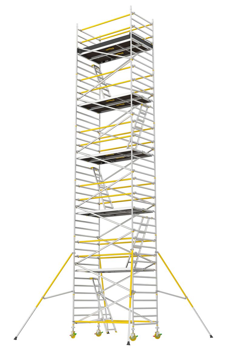 Robust og lettmontert stillas (1,4 x 2,5 m) med overlappende stag og gjennomtenkte løsninger for sikrere arbeid. Komplett med to plattformer og trappestiger hver andre meter, to topplattformer, sparkelist, justerbare hjul (200 mm) og støtteben.