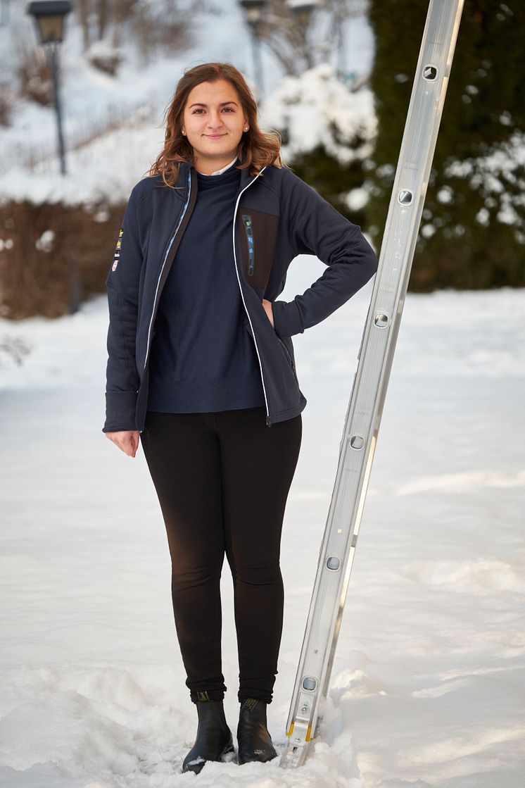 Produktsjef, Elma Delic, fra Wibe Ladders demonstrerer hvordan du kan sjekke at vinkelen på stigen er riktig.