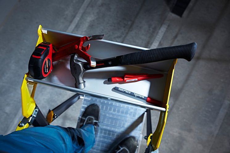 90P er en stabil og sikker trappestige med en robust konstruksjon med svært god holdbarhet. Stigen har ekstra stor plattform med toveis antiskli og fallsikring på tre sider, slik at du kan arbeide mer avslappet, effektivt og sikkert - også under mer krevende oppgaver. Denne premium-modellen forenkler din arbeidag med en robust metallhylle for verktøy, maskiner og materialer.