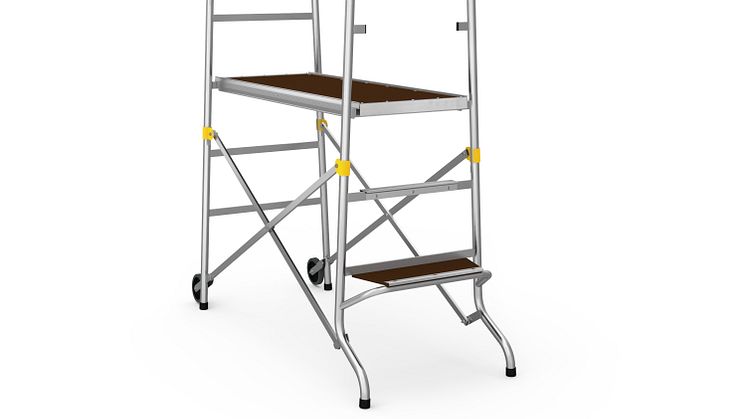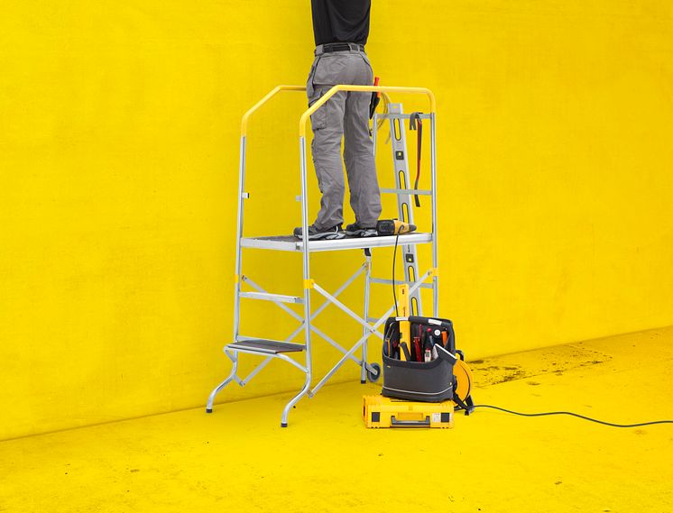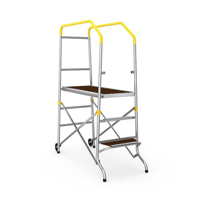 Punkteringssikre hjul gjør det mulig å flytte plattformen, og en smart avfasning på rekkverket gjør det enkelt å rulle plattformen gjennom en døråpning. Rammene heller innover for økt stabilitet og plattformen på 1200 x 440 mm gir en stor arbeidsflate som kan justeres i fire ulike høyder opp til 1260 mm. Dypere trinn og et åpent trinn øverst som du ikke trenger å klatre over, gjør det enklere og mer komfortabelt å klatre opp og ned.